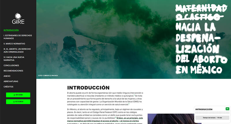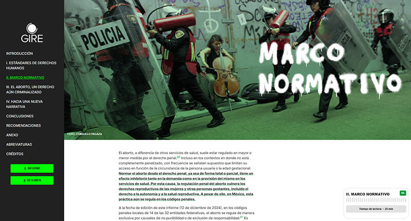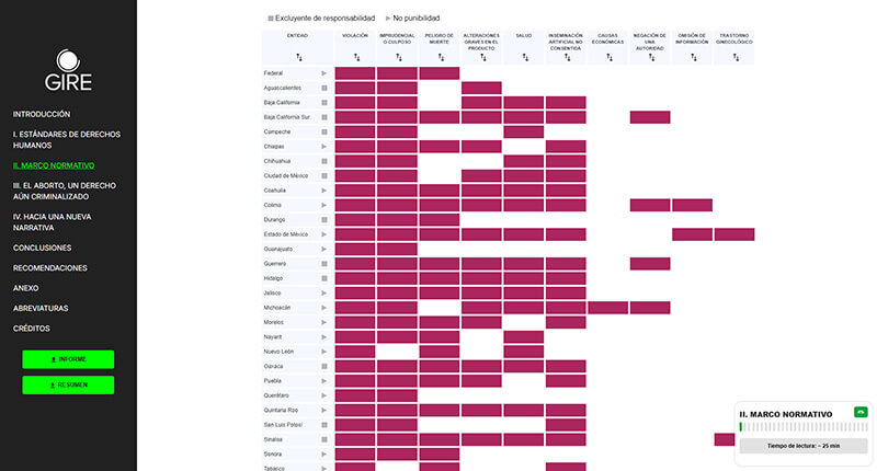 Sitio interactivo que desarrollado para GIRE (Grupo de Información en Reproducción Elegida) que funciona como un informe digital y repositorio de datos sobre cómo se ha criminalizado el aborto en México. Es una herramienta de investigación, transparencia y denuncia que combina análisis legal, datos públicos y casos documentados para evidenciar el problema desde una perspectiva de derechos humanos.