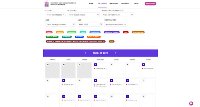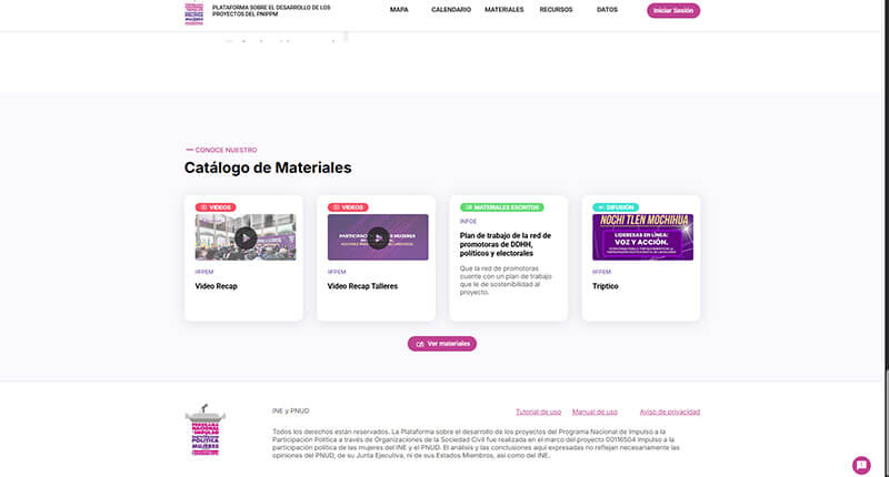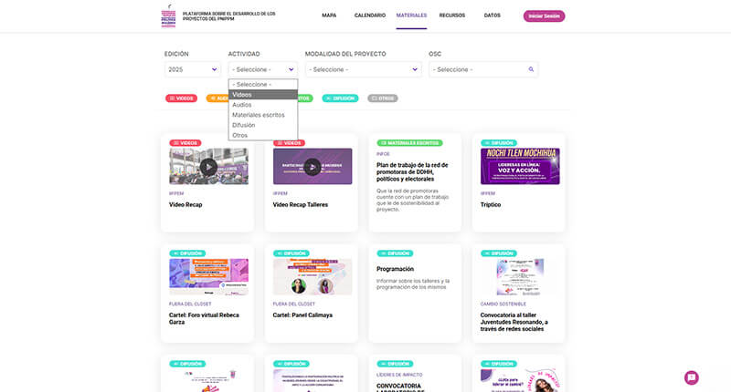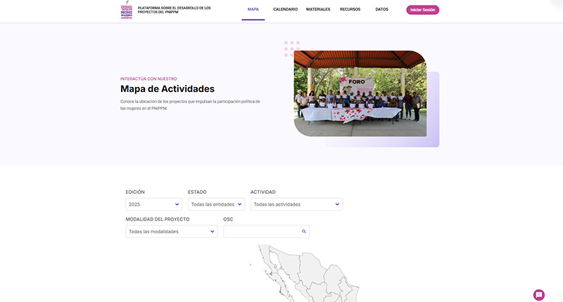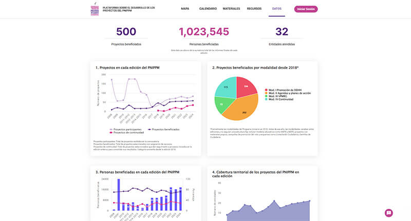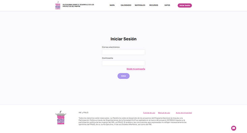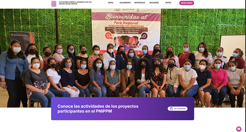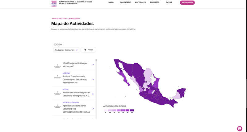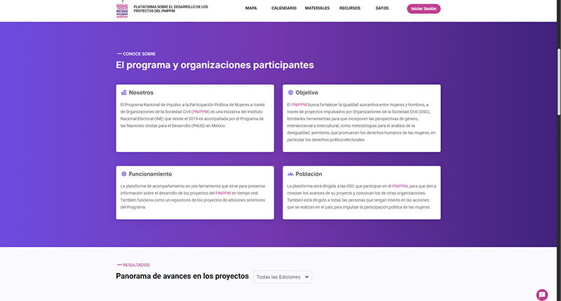 Sistema digital de seguimiento y visualización del desarrollo de proyectos que forman parte del Progama Nacional de Impulso a la Participación Política de las Mujeres a través de organizaciones de la sociedad civil. Su objetivo principal es centralizar información y permitir al usuario explorar, consultar o buscar proyectos específicos dentro de las diversas ediciones que ha tenido este programa.